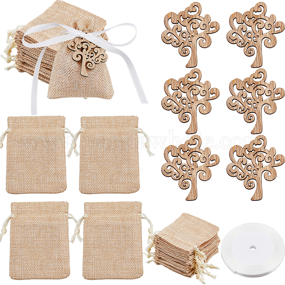36шт деревянные кабошоны, вырезанные лазером деревянные формы, древо жизни, с 36шт. мешочков с завязками и 1рулоном односторонней атласной ленты