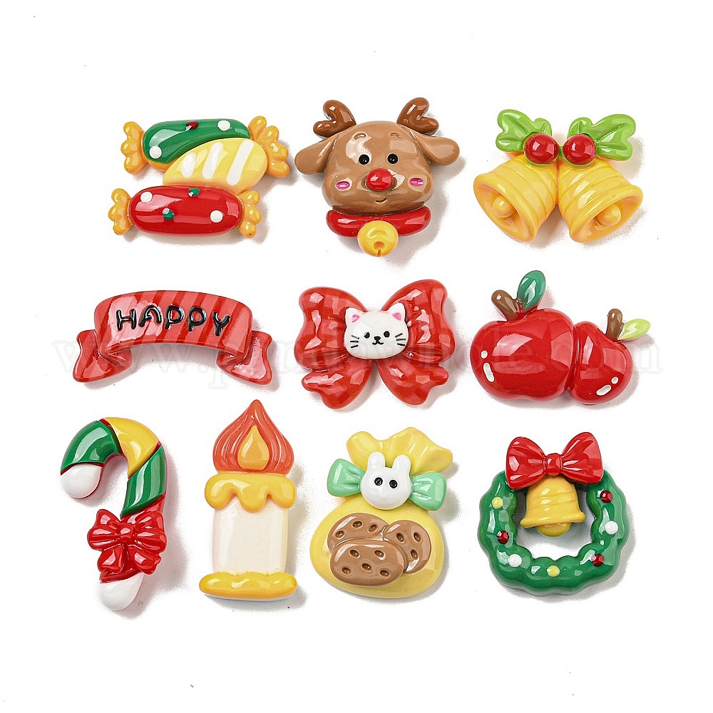Рождественская тема, непрозрачная смола, декодированные кабошоны, Рождественский колокольчик/бантик/яблоко/конфета/конфеты/олень/сумка/свеча/венок (02W2F5)