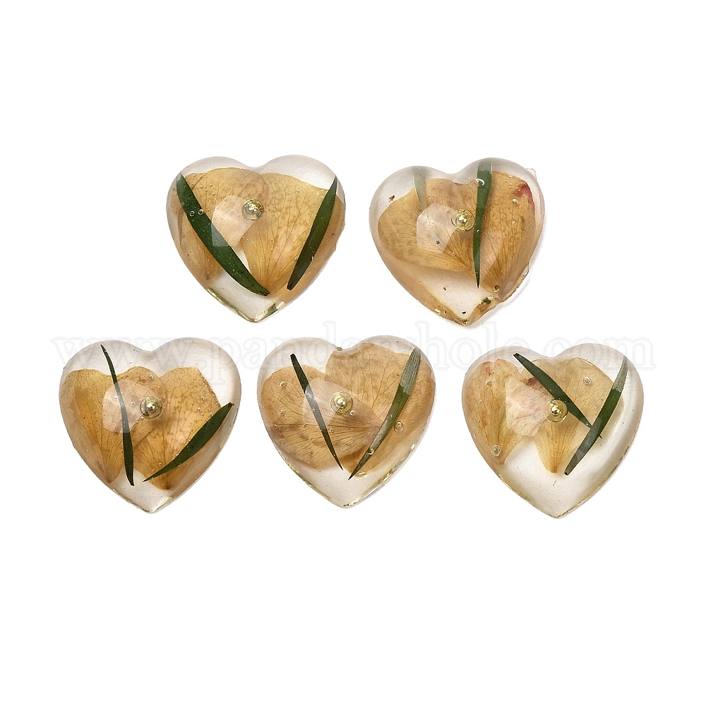 • Золотистый Прозрачные смолы кабошоны, в форме сердца с засушенным цветком внутри, золотые, 19~19.5x19.5x6 мм