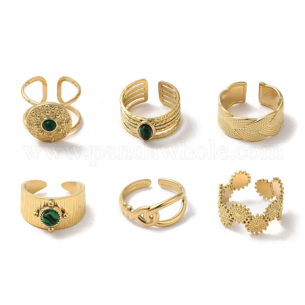 6 шт. 6 стиль, плоские, круглые, овальные и полые 304 набор открытых манжет из нержавеющей стали, Наборные кольца из синтетического малахита и малайзийского нефрита