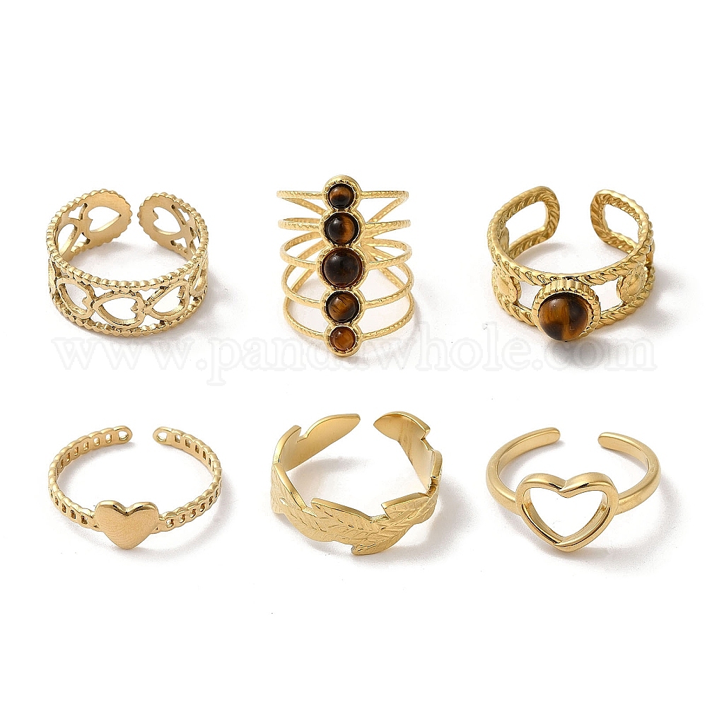 • Настоящее золото 18K 6 шт. 6 стиль лист, сердце и капля 304 набор открытых манжет из нержавеющей стали, штабелируемые кольца из натурального тигрового глаза, реальный 18 k позолоченный, внутренний диаметр: 17~18 мм, 1 шт / стиль