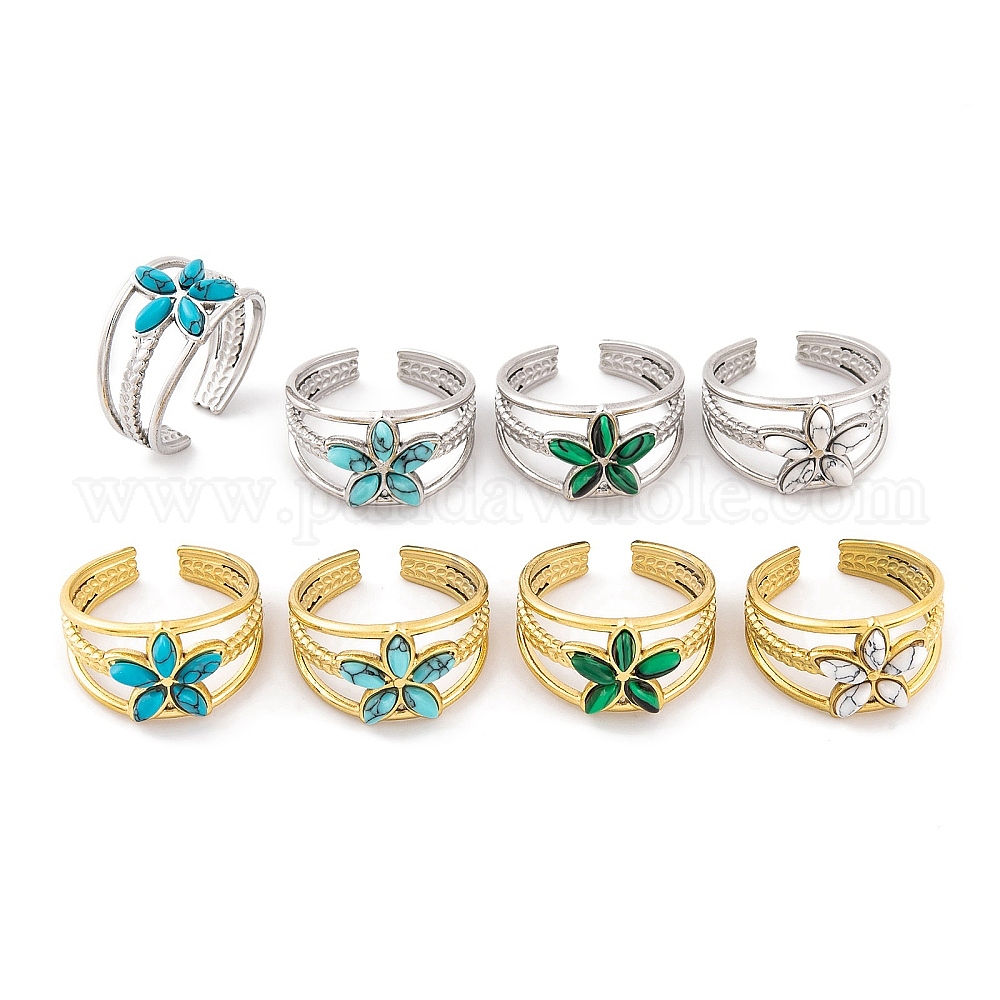 Цветок 304 открытые манжетные кольца из нержавеющей стали с ионным покрытием (IP), женские кольца с синтетической бирюзой и малахитом