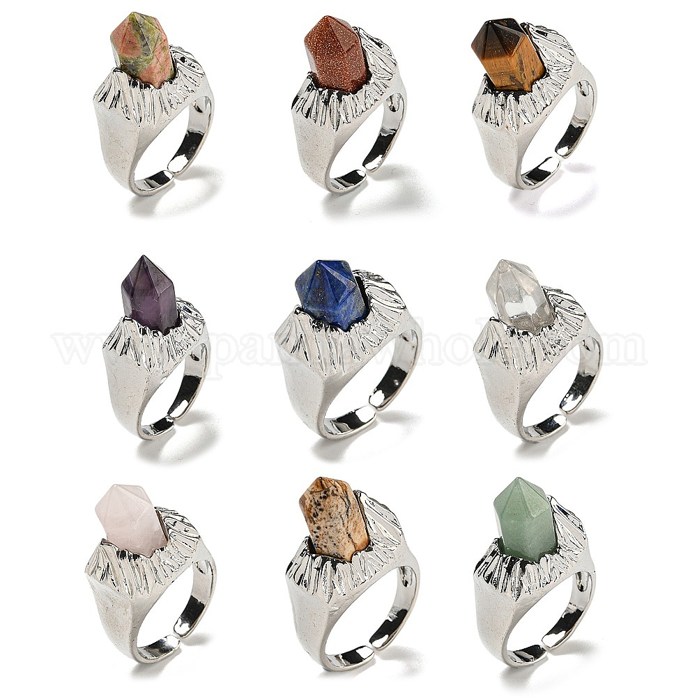 • Смешанные камни Открытые манжеты с шестиугольной призмой из натуральных и синтетических драгоценных камней и стекла, покрытие стойки латунное кольцо для унисекс, внутренний диаметр: регулируемый