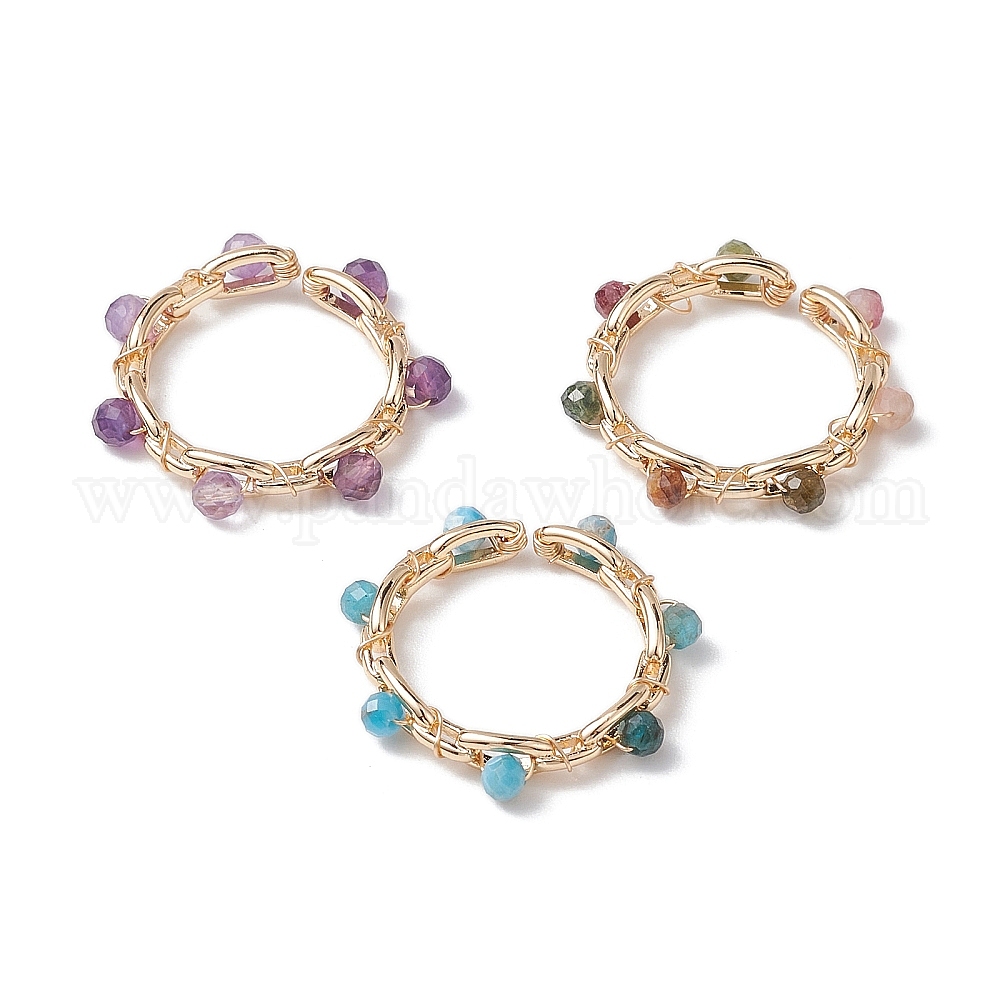 • Смешанные камни Открытое кольцо-манжета круглой формы с бусинами из смешанных драгоценных камней, украшения из медной проволоки для женщин, 4 мм