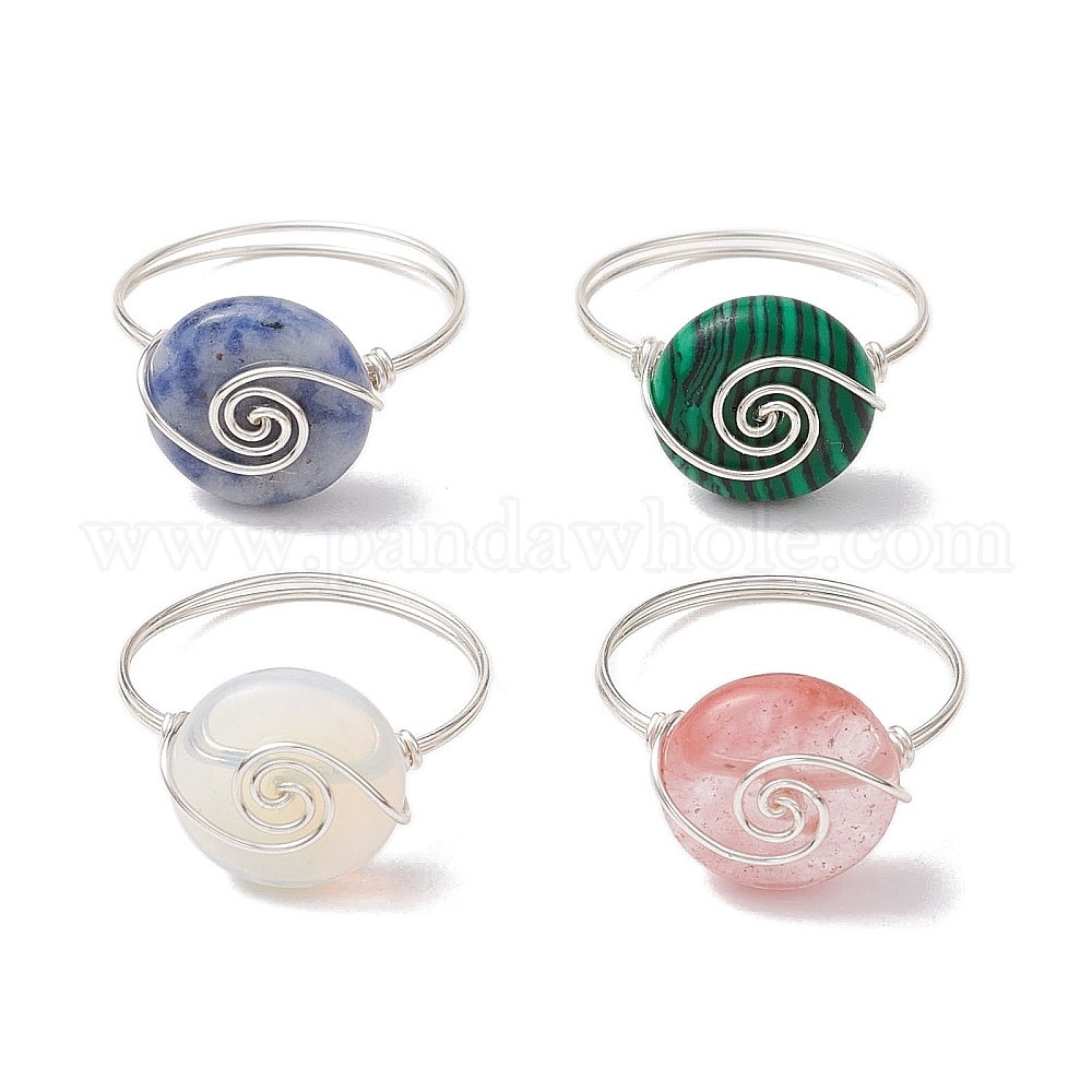 Плоские круглые кольца из синтетического малахита, вишневого кварцевого стекла, опалита и натуральной голубой пятнистой яшмы, кольцо из медной проволоки для унисекс