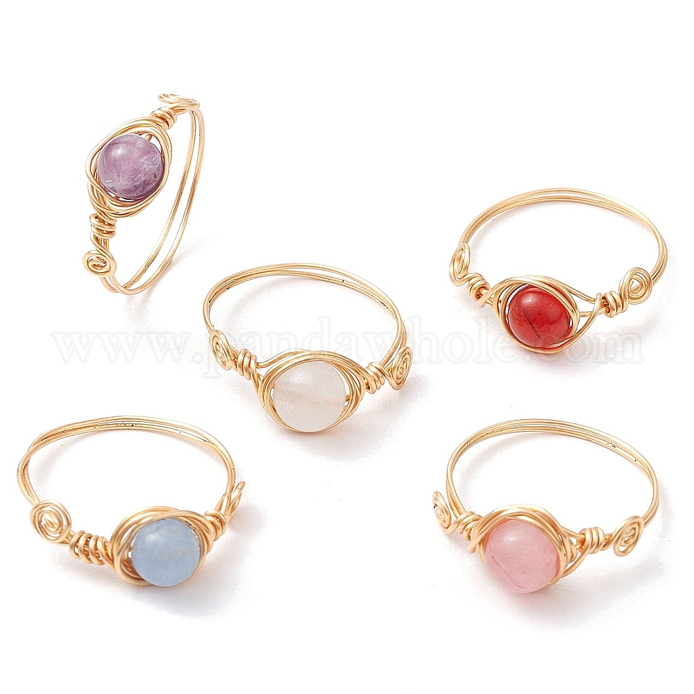 Кольца с круглым натуральным кварцевым кристаллом, розовым кварцем, кварцем, малайзийским нефритом и аметистом, женское кольцо из медной проволоки
