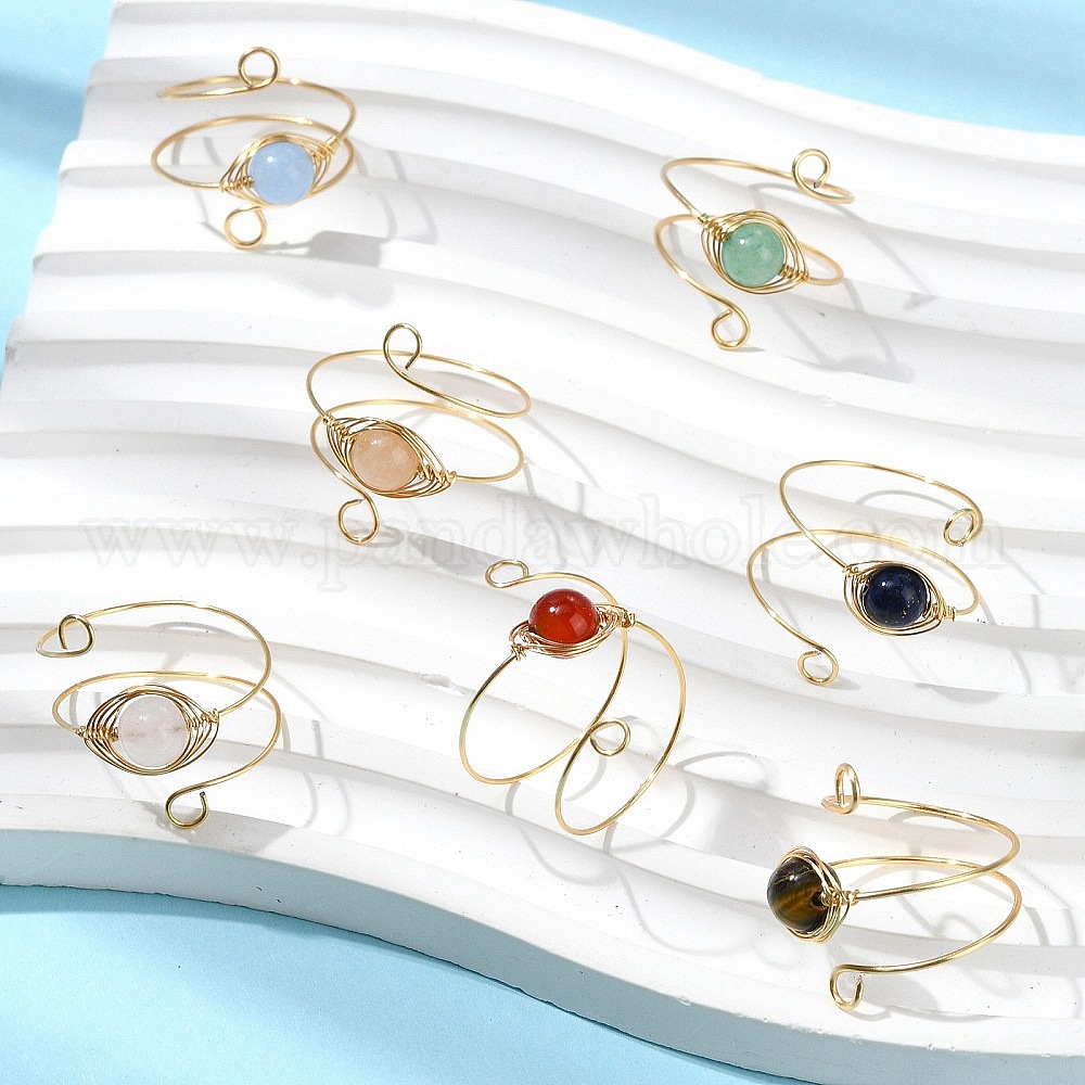7 шт. 7 стили натуральный лазурит и розовый кварц и зеленый авантюрин и сердолик (окрашенный и нагретый) и тигровый глаз и окрашенный белый нефрит кольца с конским глазом, золотые тона медной проволоки для женщин
