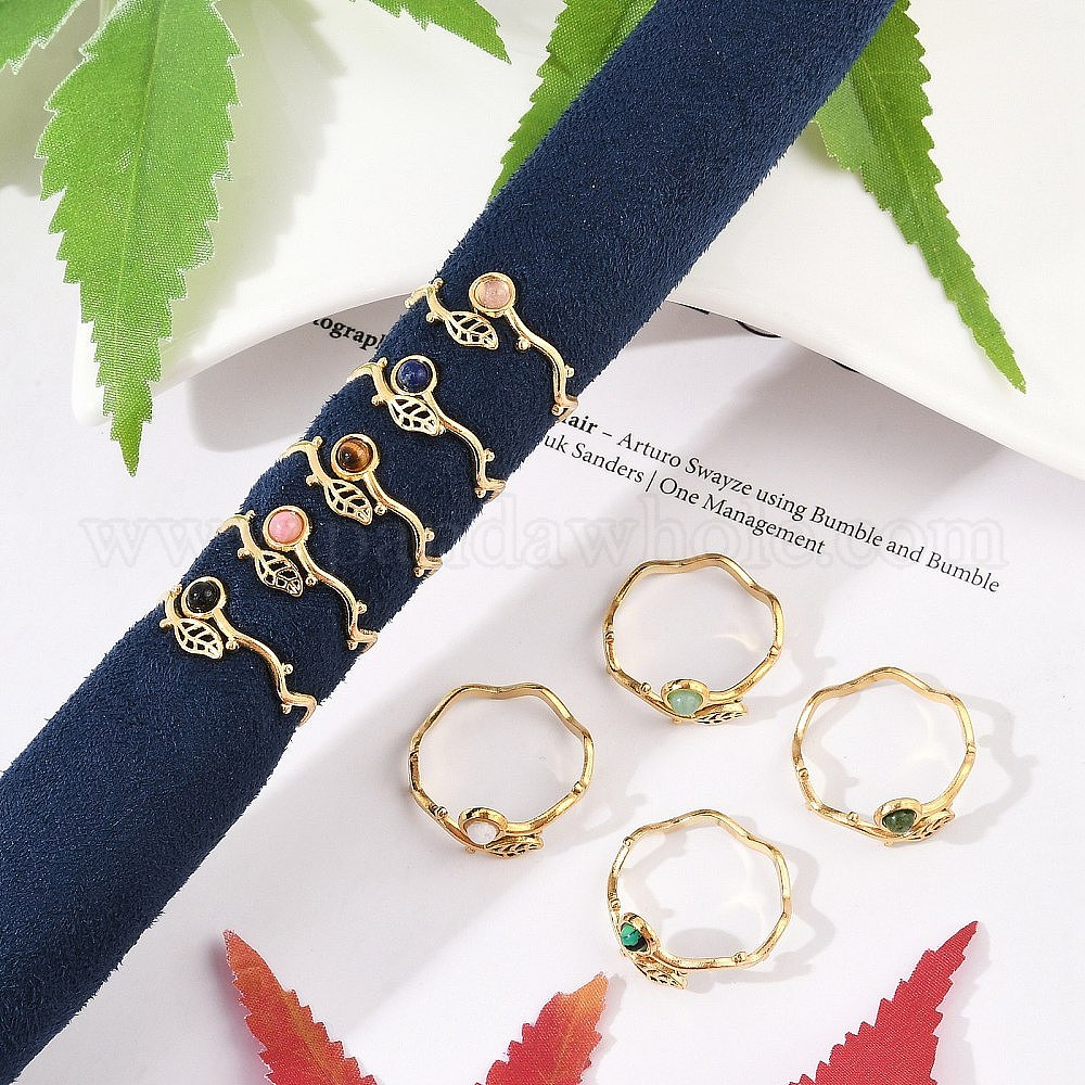 Лист 304 открытые манжетные кольца из нержавеющей стали, кольцо из натурального камня для женщин, реальный 18 k позолоченный, ионное покрытие (ip)
