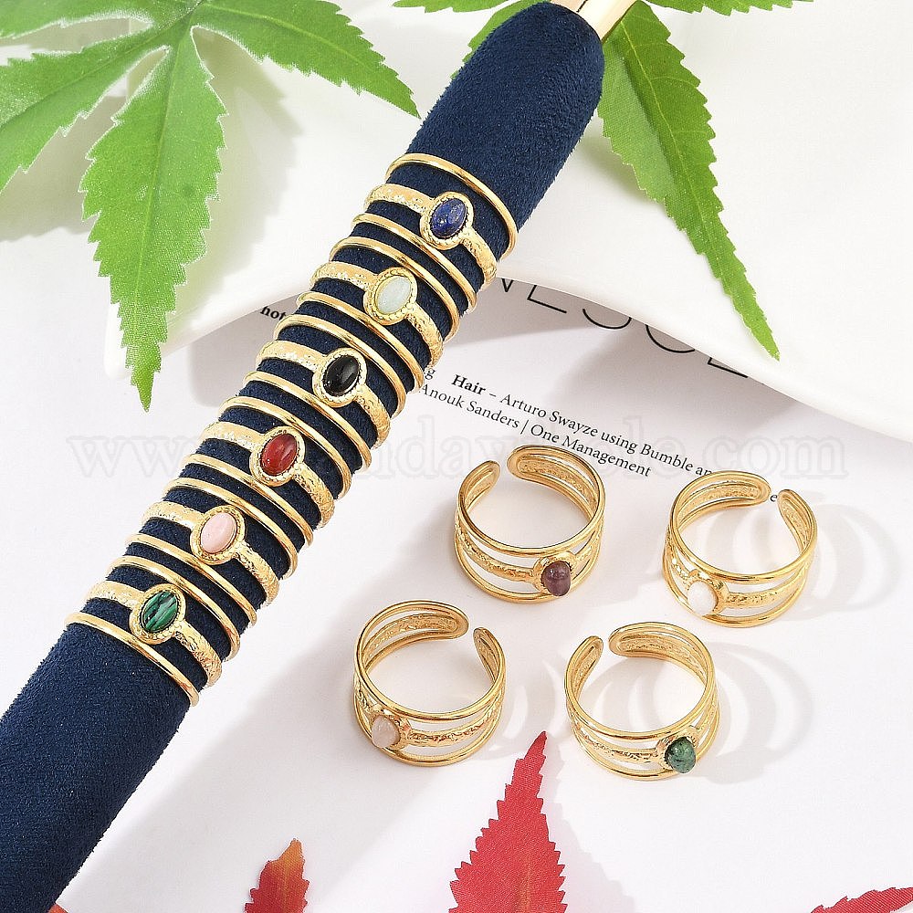 304 многослойные открытые манжеты из нержавеющей стали, овальное кольцо с натуральным драгоценным камнем для женщин, реальный 18 k позолоченный, ионное покрытие (ip)