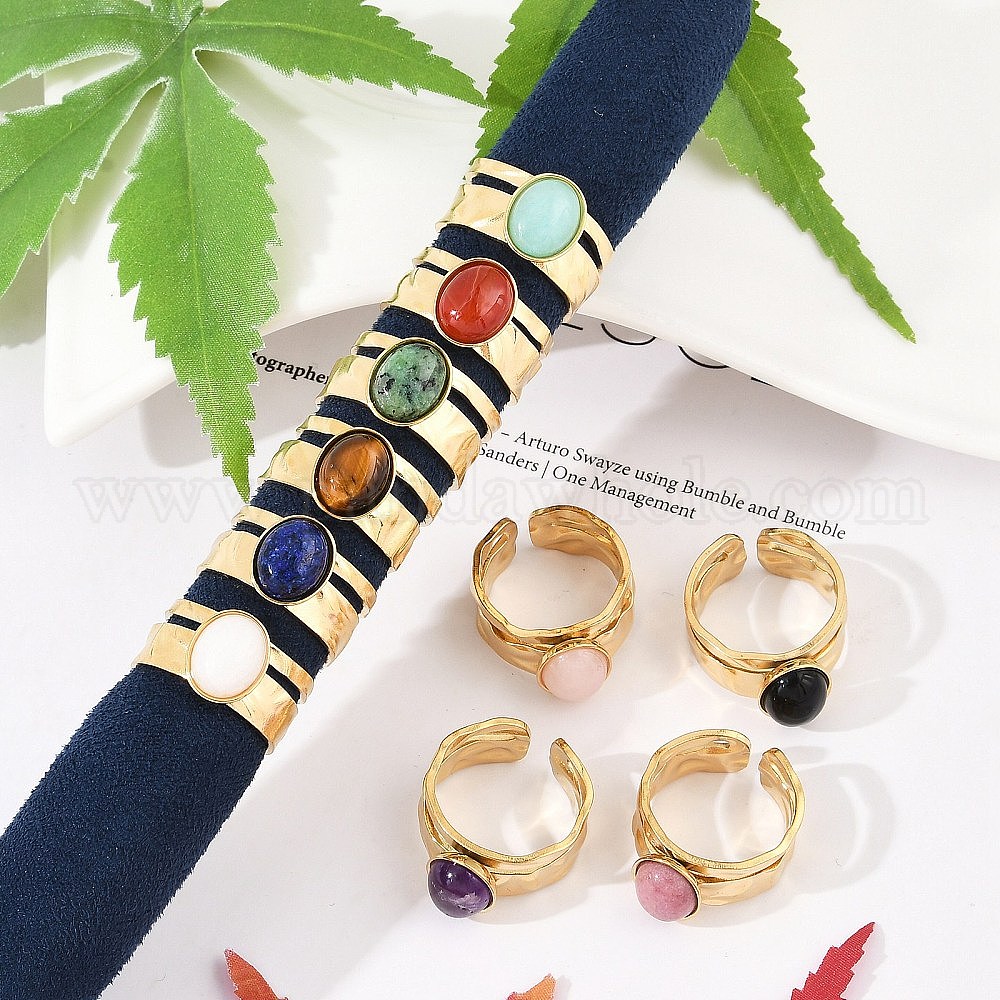 304 открытые манжеты из нержавеющей стали, овальное кольцо с натуральным драгоценным камнем для женщин, реальный 18 k позолоченный, ионное покрытие (ip)
