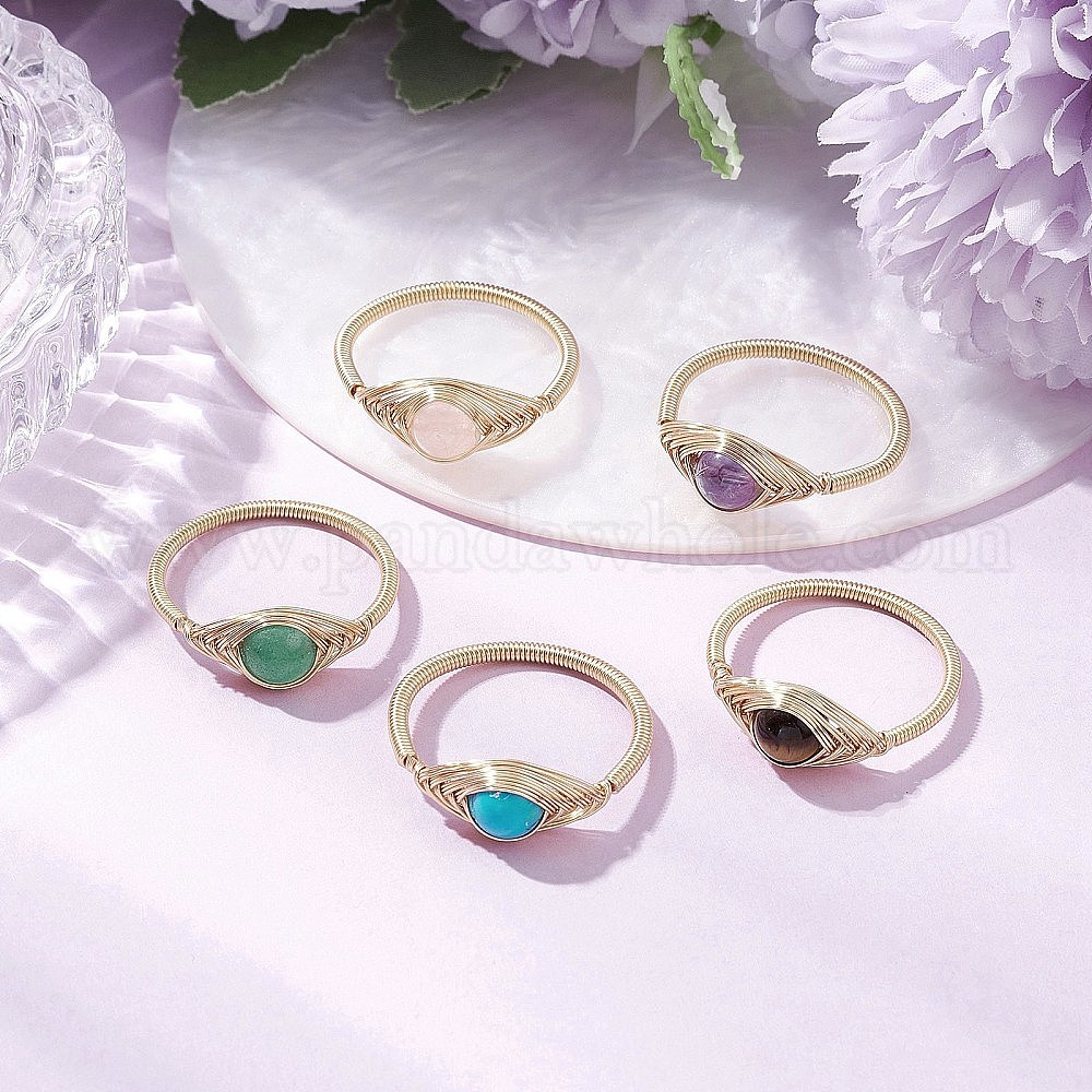 • Золотой Кольца из натурального зеленого авантюрина с конским глазом, тигрового глаза, аметиста, розового кварца и синтетической бирюзы, кольца из медной проволоки, золотые, 7~7.5 мм, внутренний диаметр: 18~19 мм
