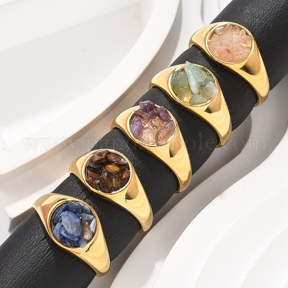 • Аметист Кольца с круглыми натуральными аметистовыми чипсами, 304 кольца из нержавеющей стали, реальный 18 k позолоченный, 10.5 мм, внутренний диаметр: 17 мм