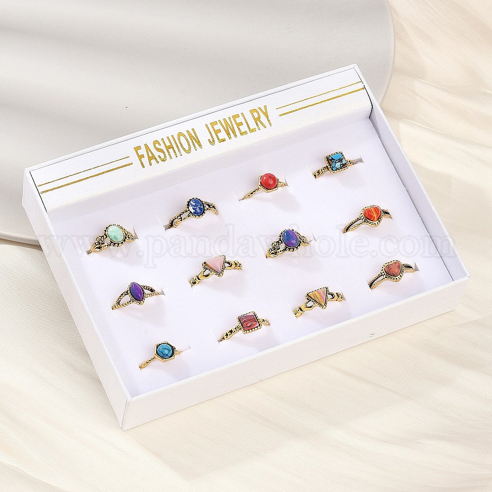 12шт. кольца из натуральной красной яшмы, малахита и синтетической бирюзы, Кольца из сплава в форме сердца, овала, треугольника, конского глаза и квадрата для женщин