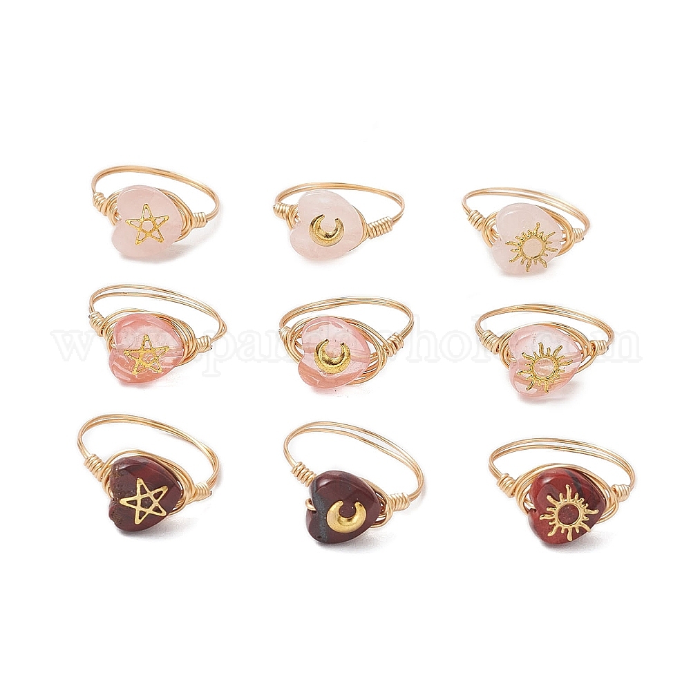 Кольца из латуни и вишневого кварца, розового кварца, натуральной красной радужной яшмы для женщин, сердце/ звезда/ луна/ солнце