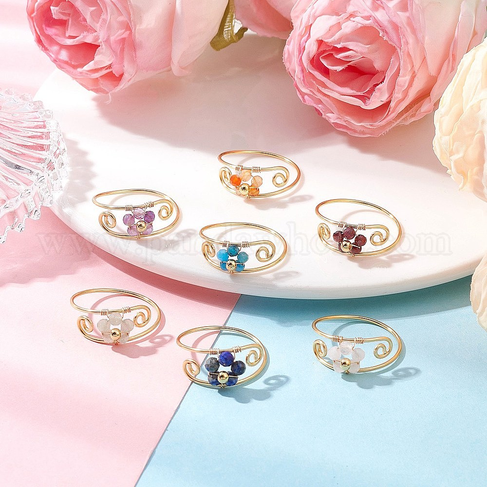 7шт. медная проволока, обернутая драгоценными камнями, ограненные круглые бусины, кольца для женщин