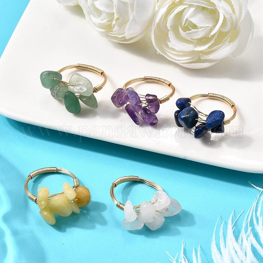 5шт. кольца из натуральных драгоценных камней, включают натуральный лазурит, натуральный розовый кварцевый чип, натуральный топаз нефритовый чип, натуральный зеленый авантюриновый чип и натуральный аметист