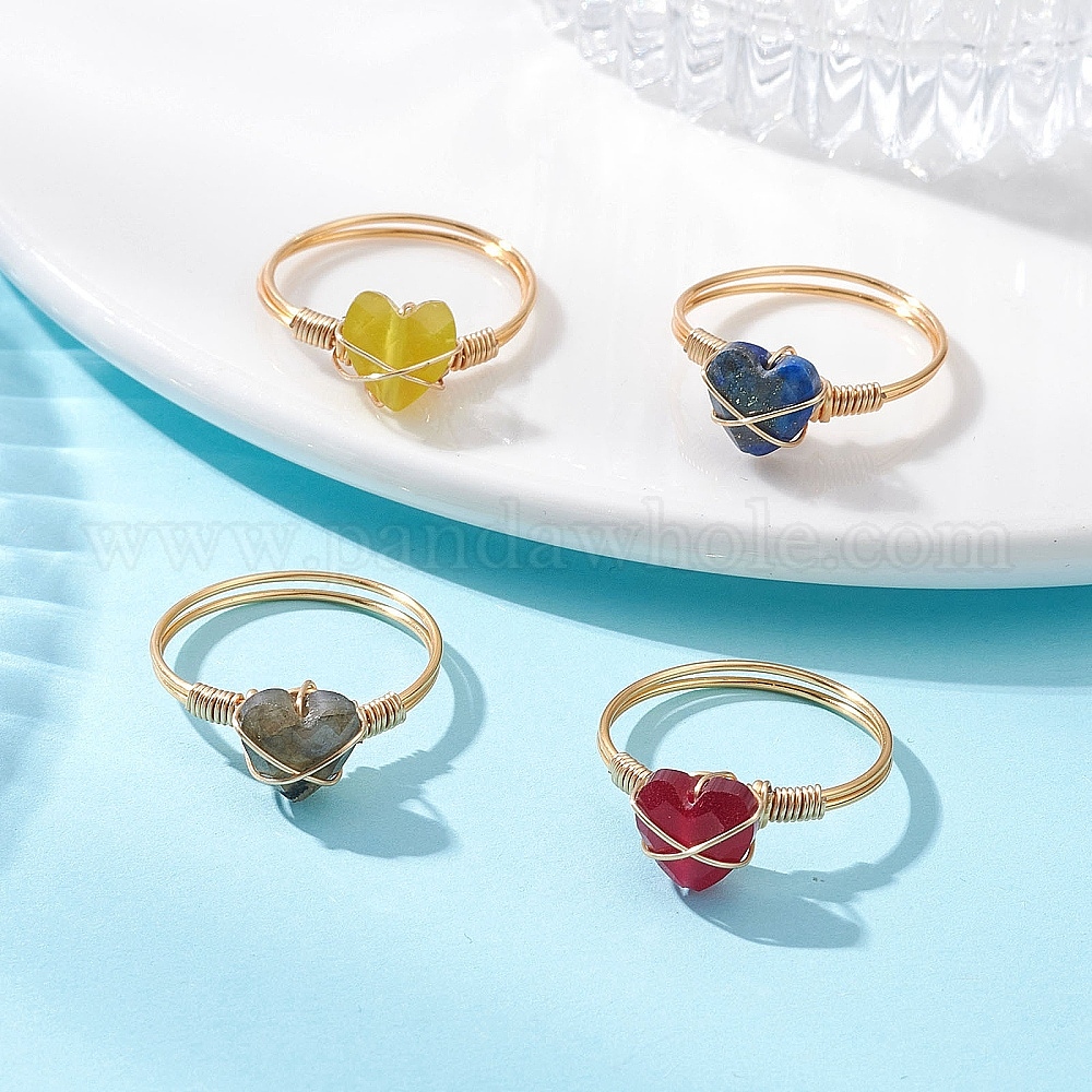 Драгоценный камень кольца палец, сердце, с латунными бусинами и экологически чистой медной проволокой