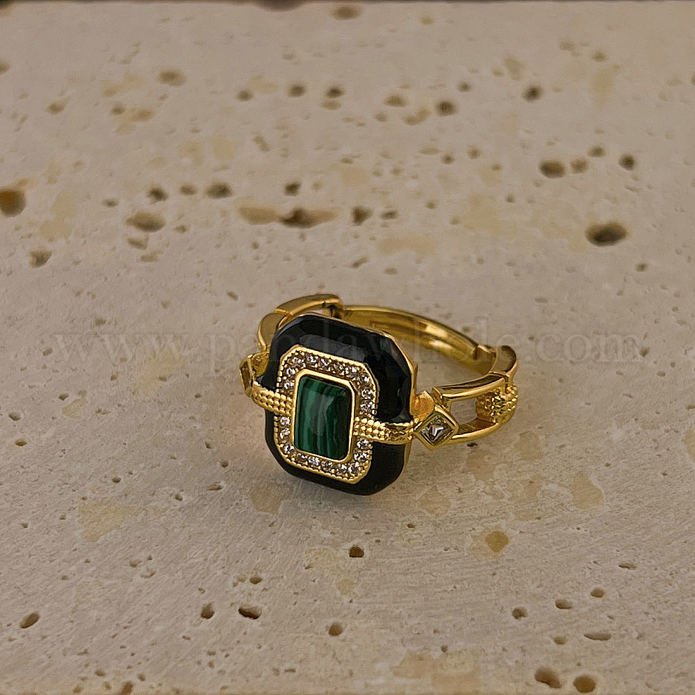 Кольца из латунного сплава, прозрачного кубического циркония, синтетического малахита и натурального черного агата., прямоугольные (03A8H7)