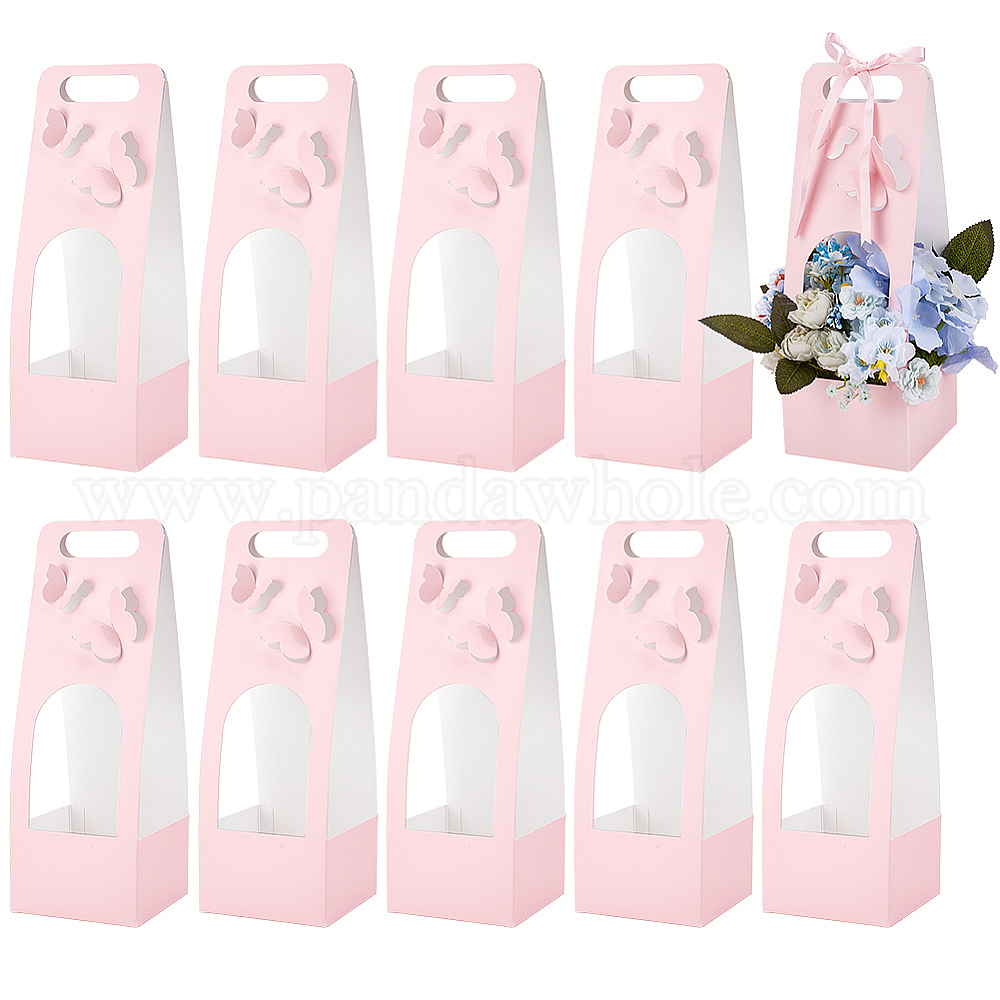 • Pink Бумажные цветочные коробки с бабочками, складные картонные подарочные коробки, Коробки для упаковки букетов свежих цветов с окошком., розовые, 12x12x34.5 см