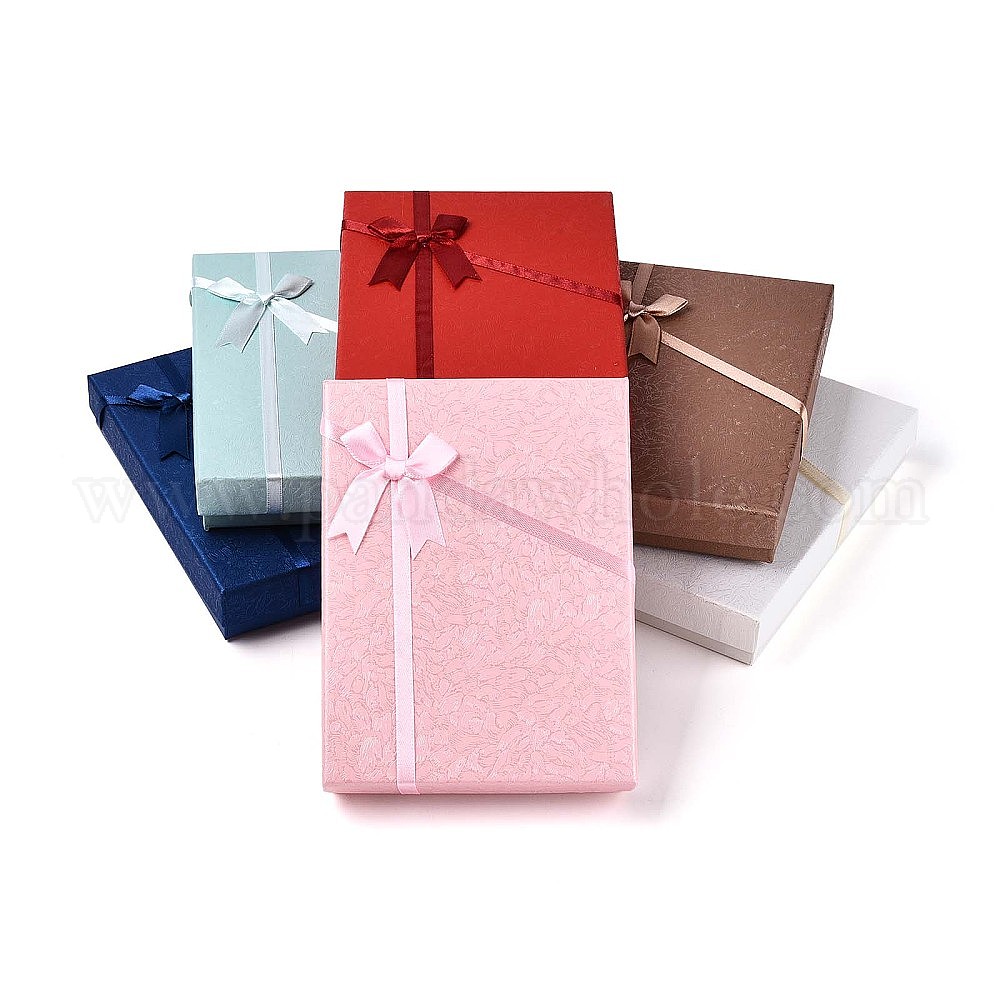 Картон комплект ювелирных изделий коробки, для ожерелья, кольцо, серьга, с лентой-бантом снаружи и белой губкой внутри, прямоугольные