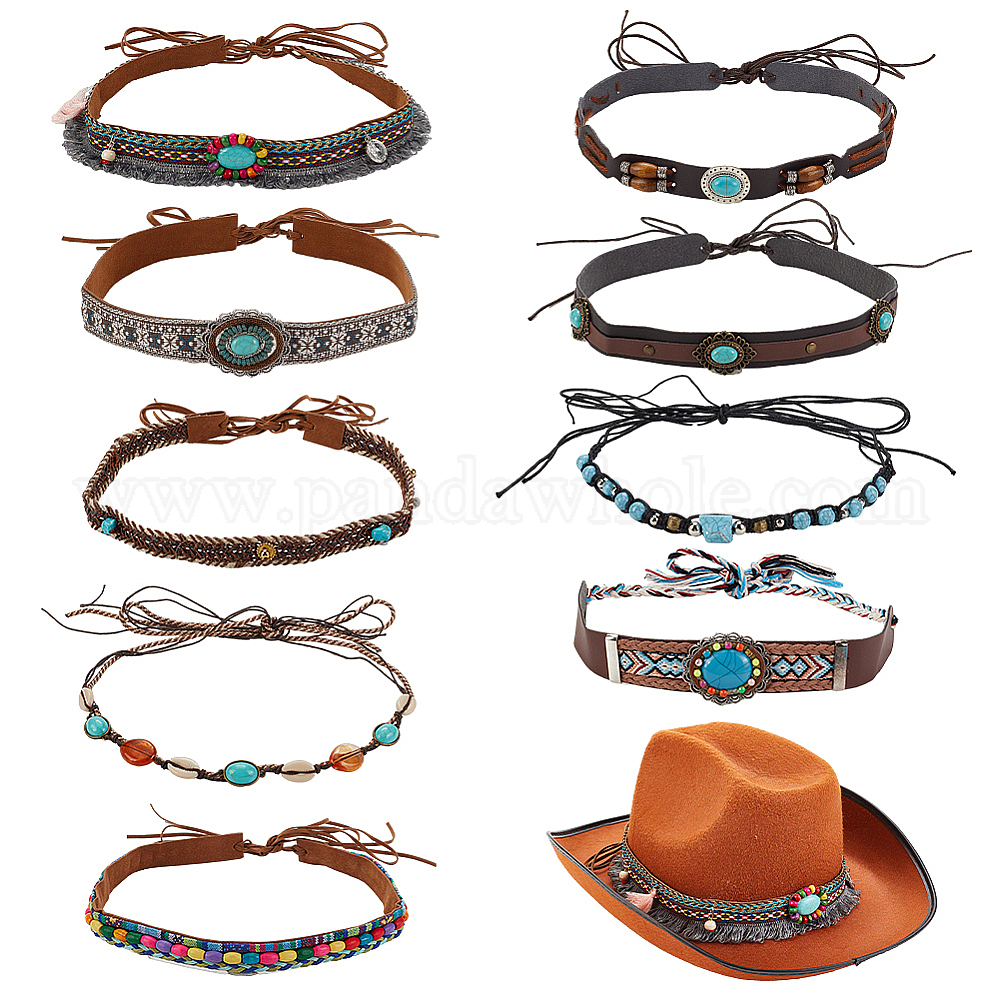 9шт. 9 стили пояс для шляпы из бархата и искусственной кожи, пластиковая лента для шляпы из имитации бирюзы и сплава для аксессуаров для шляп