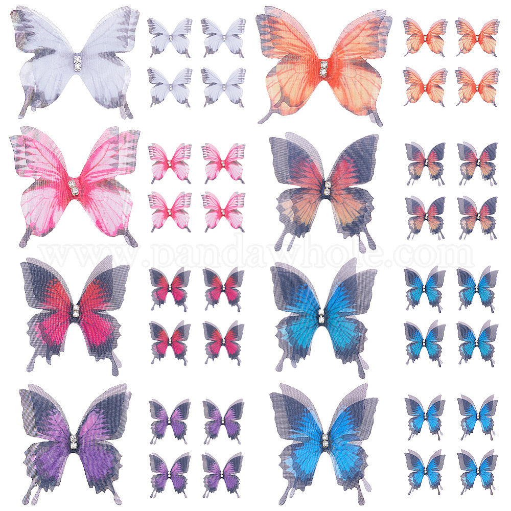 80шт. 8 цвета искусственные 2-слойные волокна тюль украшения аксессуары, 3d поделка бабочка из органзы, с кристально горный хрусталь