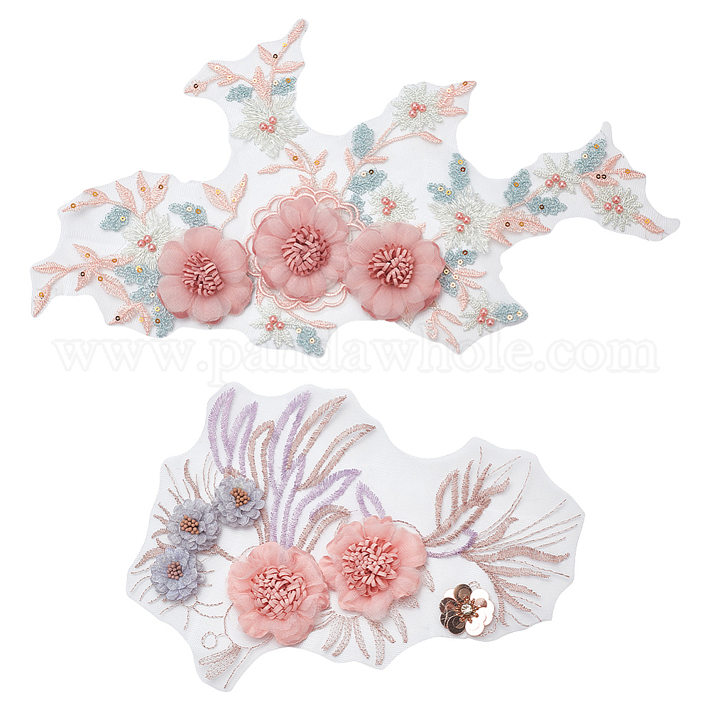 • Бледно-Розовый 2шт 2 стили 3d цветочный узор полиэстер кружевные аппликации с вышивкой, шитье украшений, аксессуары для костюмов своими руками, розовый жемчуг, 250~415x170~180x15~17 мм, 1 шт / стиль