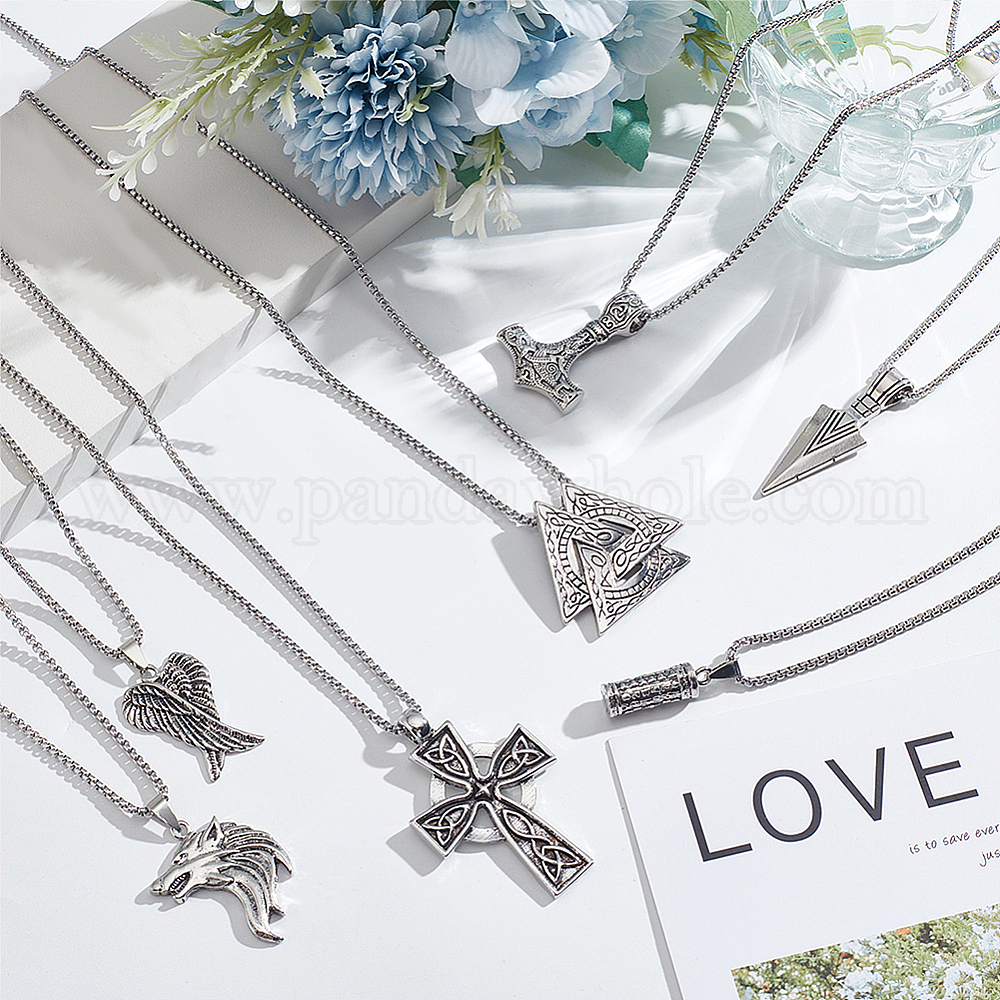 7шт 7 комплект ожерелий с подвесками в виде стрелы, волка, креста, топора и крыла, Подвески из сплава , цепи из нержавеющей стали, скандинавские украшения викингов для мужчин и женщин