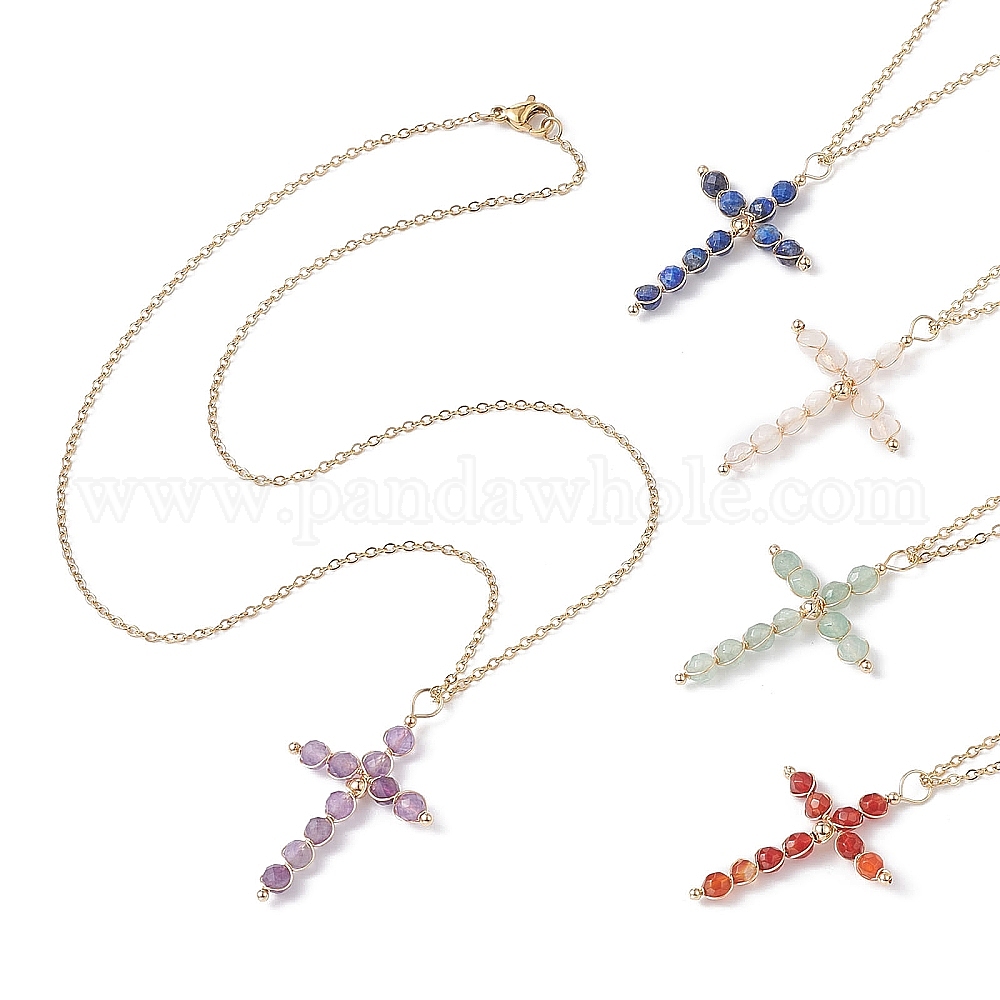 Колье с подвеской в виде креста из бисера из натуральных смешанных драгоценных камней, золотая нержавеющая сталь для женщин