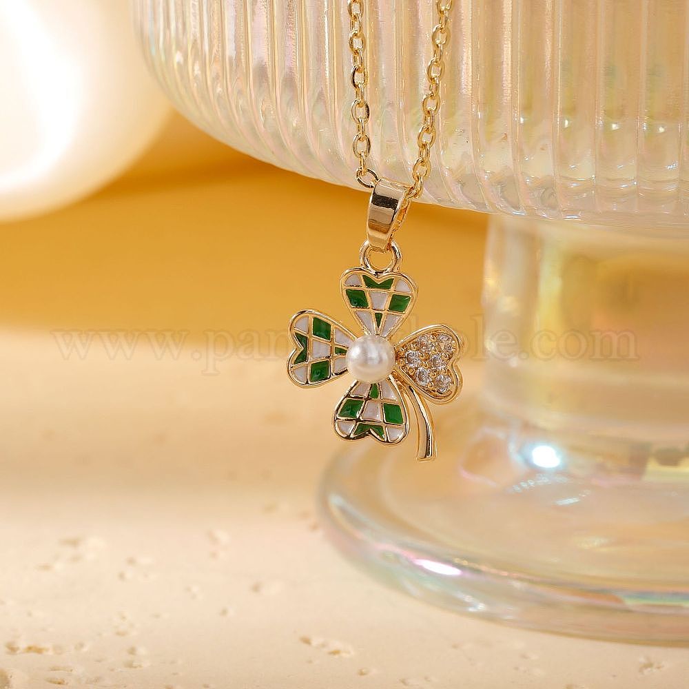 Ожерелья с подвесками из латуни с прозрачными кубическими цирконами, с эмалью и имитация жемчуга, Четыре листа клевера