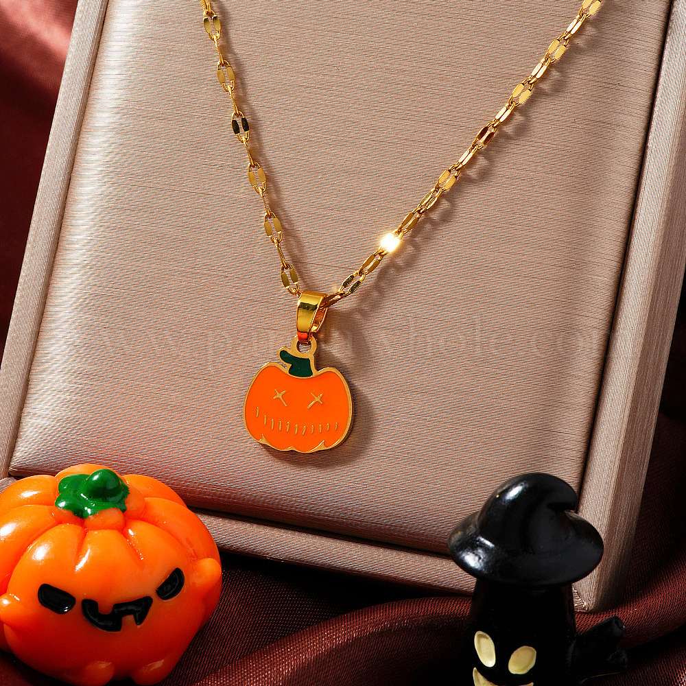 304 цепочка с подвеской в виде тыквы из нержавеющей стали с эмалью на Хэллоуин, золотые