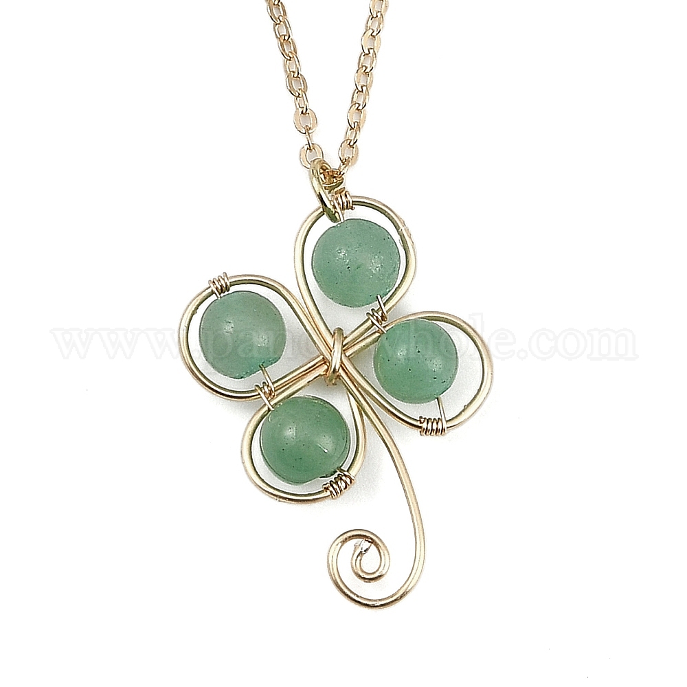 Клевер медная проволока обернутая натуральный зеленый авантюрин клевер кулон ожерелья, Железные ожерелья, кабель цепи