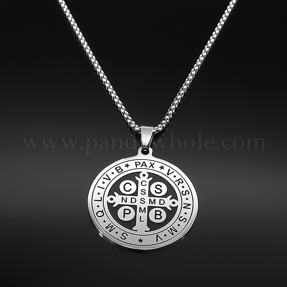 201 подвесные из нержавеющей стали ожерелья, плоский раунд с cssml ndsmd крест бог отец / святой бенедикт