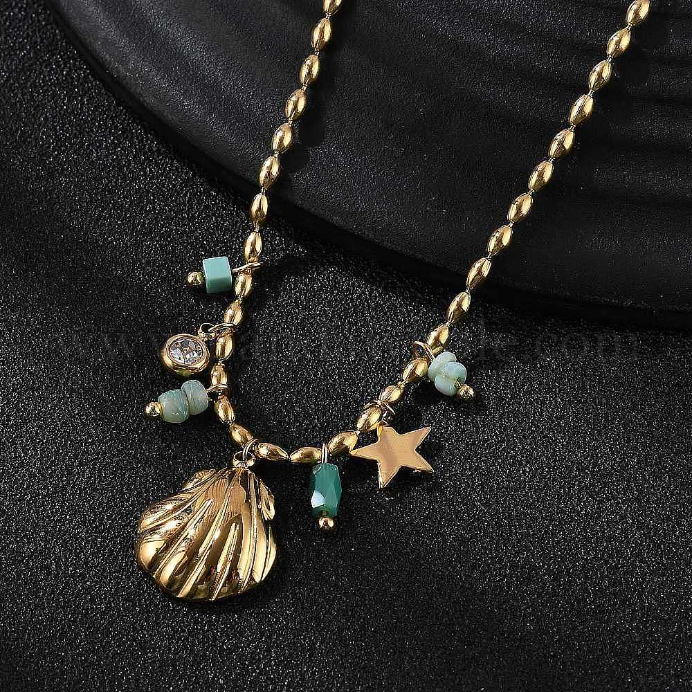 • Настоящее золото 18K Пляж 304 ожерелья с подвесками в форме ракушек из нержавеющей стали и страз для женщин, реальный 18 k позолоченный, 15.75 дюйм (40 см)