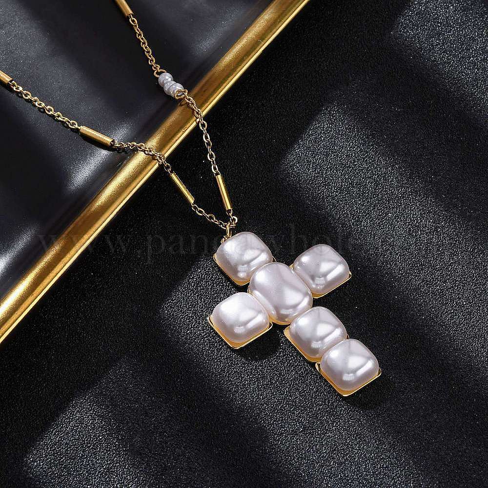 Крест 304 ожерелья из нержавеющей стали и пластикового жемчуга для женщин, ионное покрытие (ip)
