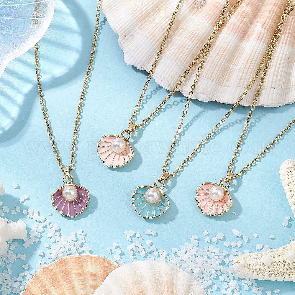 Ожерелья с подвеской в форме ракушки из сплава эмали и АБС-пластика с имитацией жемчуга, 304 из нержавеющей стали Кабельные зажимы ожерелья, золотые