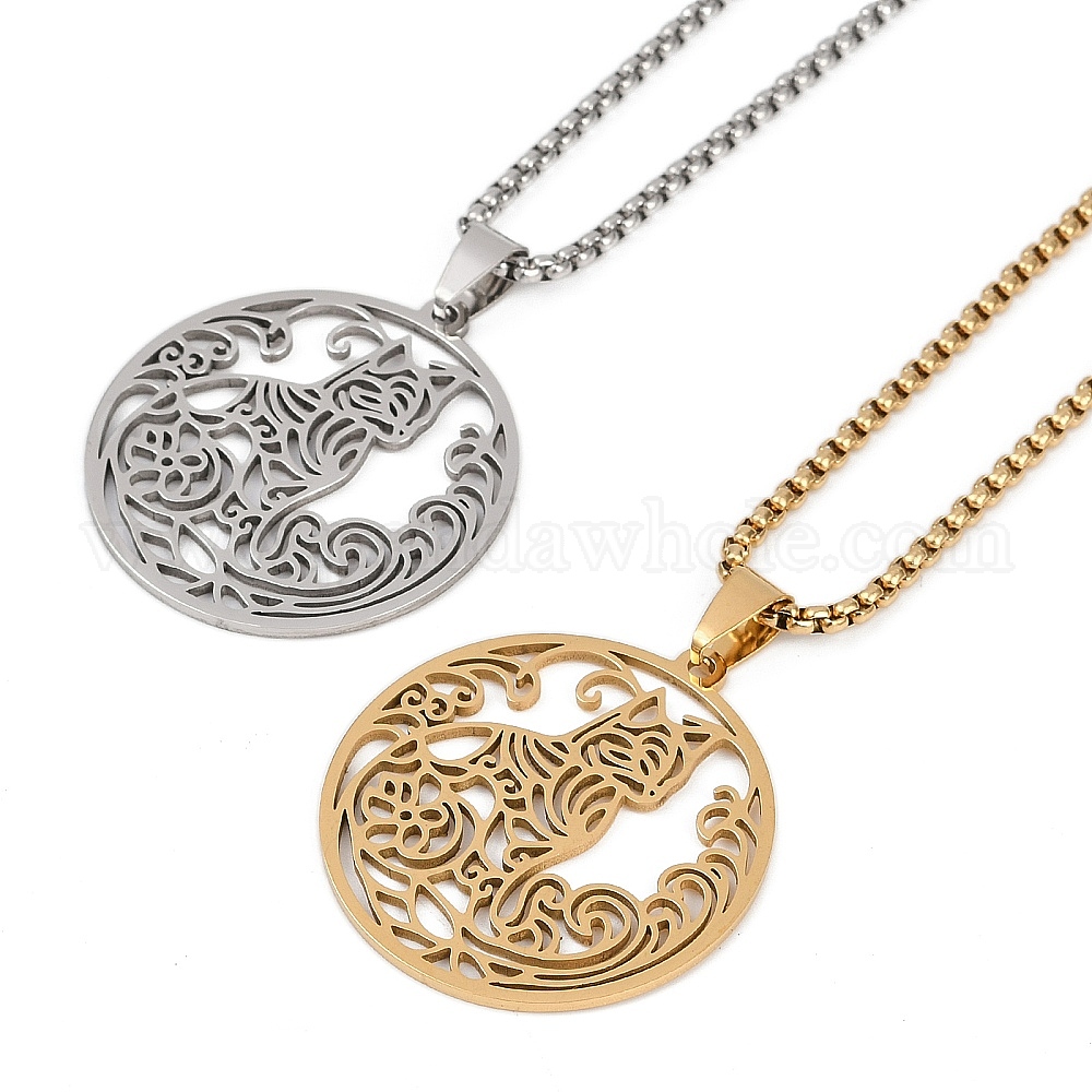 • Золотой Кольцо с рисунком в форме кошки 201 ожерелья из нержавеющей стали с подвеской для мужчин и женщин, Ожерелья с цепочкой, золотые, 23.62 дюйм (60 см)