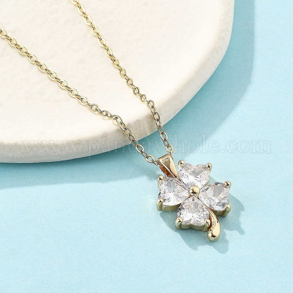 Латунный микропаве кубический цирконий четырехлистный клевер кулон ожерелья для женщин, с 304 цепи из нержавеющей стали, ионное покрытие (ip)