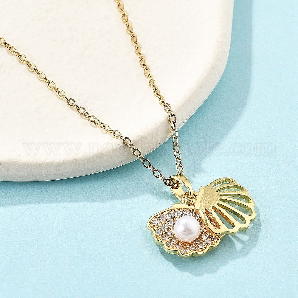Латунный микропаве кубический цирконий в форме ракушки кулон ожерелья для женщин, с 304 цепочкой из нержавеющей стали и пластиковой имитацией жемчуга, ионное покрытие (ip)