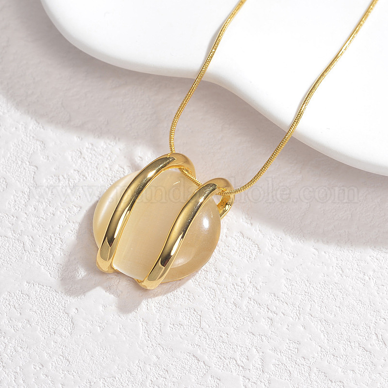 • Золотой 304 Женские плоские круглые подвески из нержавеющей стали и кошачьего глаза, цвет пшеницы, золотые, 15.87 дюйм (40.3 см)