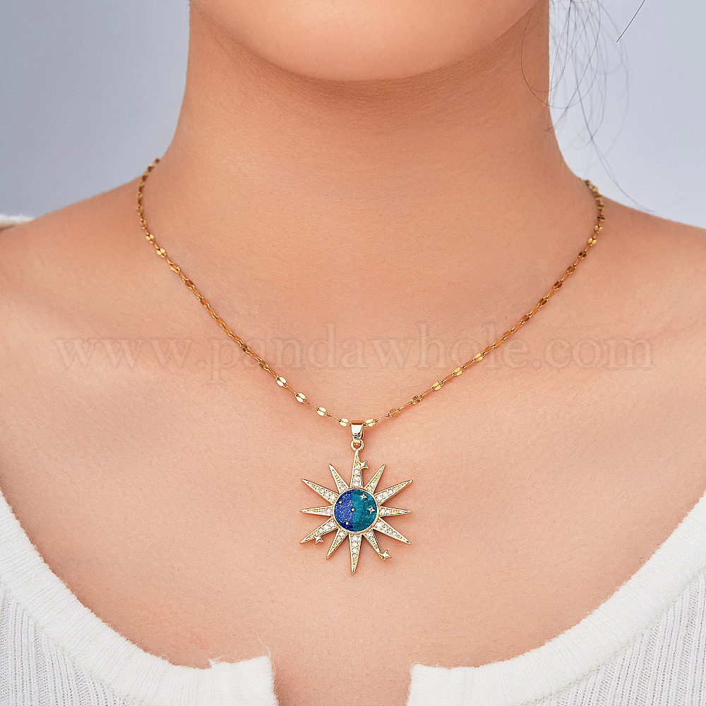 • Солнце Женские подвески из латуни с блестящими прозрачными кубическими цирконами и синей эмалью, золотые, солнце, 15.75 дюйм (40 см)
