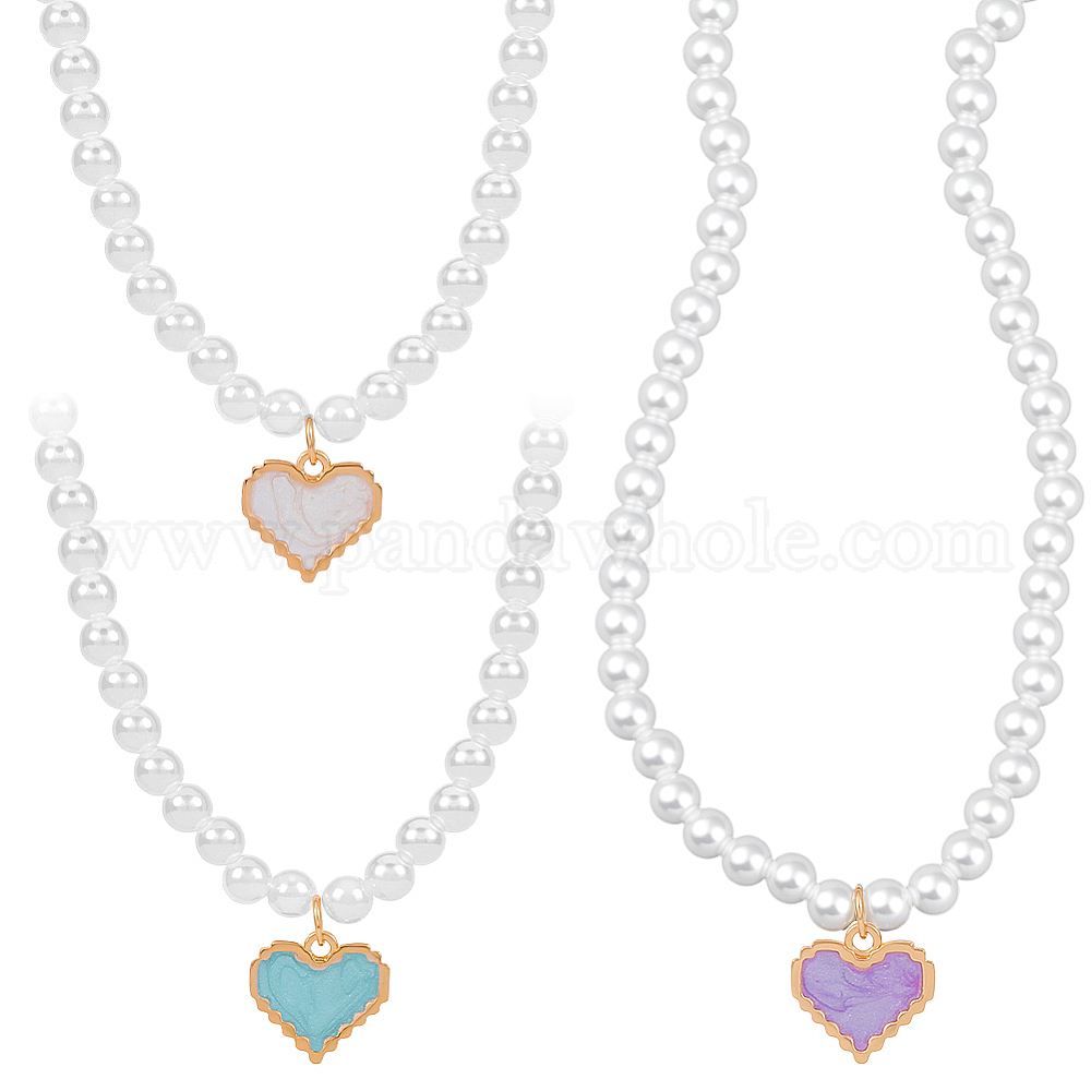 3 шт. 3 ожерелья с подвеской в виде сердца из сплава и эмали разных цветов, белые круглые бусины из искусственного жемчуга для женщин, золотой свет
