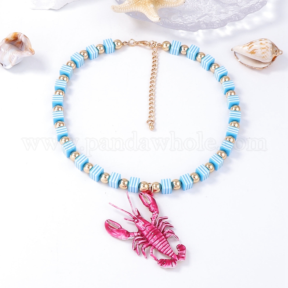 Подвеска в виде розового лобстера из пластика, ожерелье из квадратных бусин в полоску с цепочками на концах из сплава, золотые