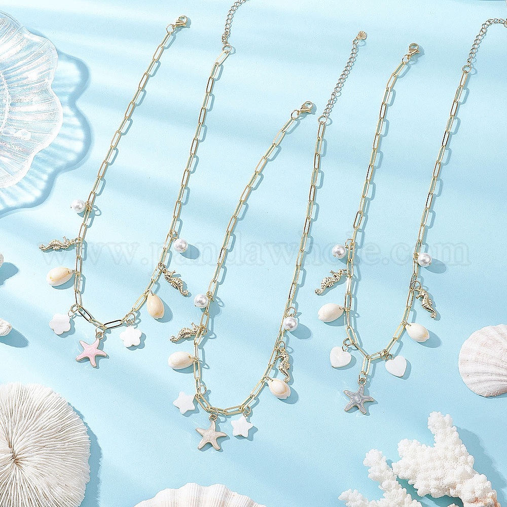 • (52) Непрозрачная лаванда 3 шт. 3 стили, сплав, эмаль, морская звезда, морской конек и натуральные ракушки, латунные ожерелья в виде скрепки для женщин, золотые, разноцветные, 16.54 дюйм (42 см), 1 шт / стиль