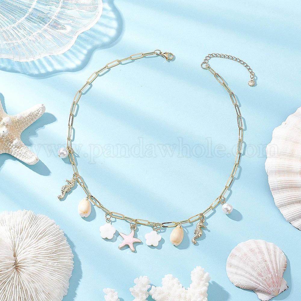 Женские латунные ожерелья-скрепки из сплава эмали, морской звезды, морского конька и натуральной ракушки, золотые