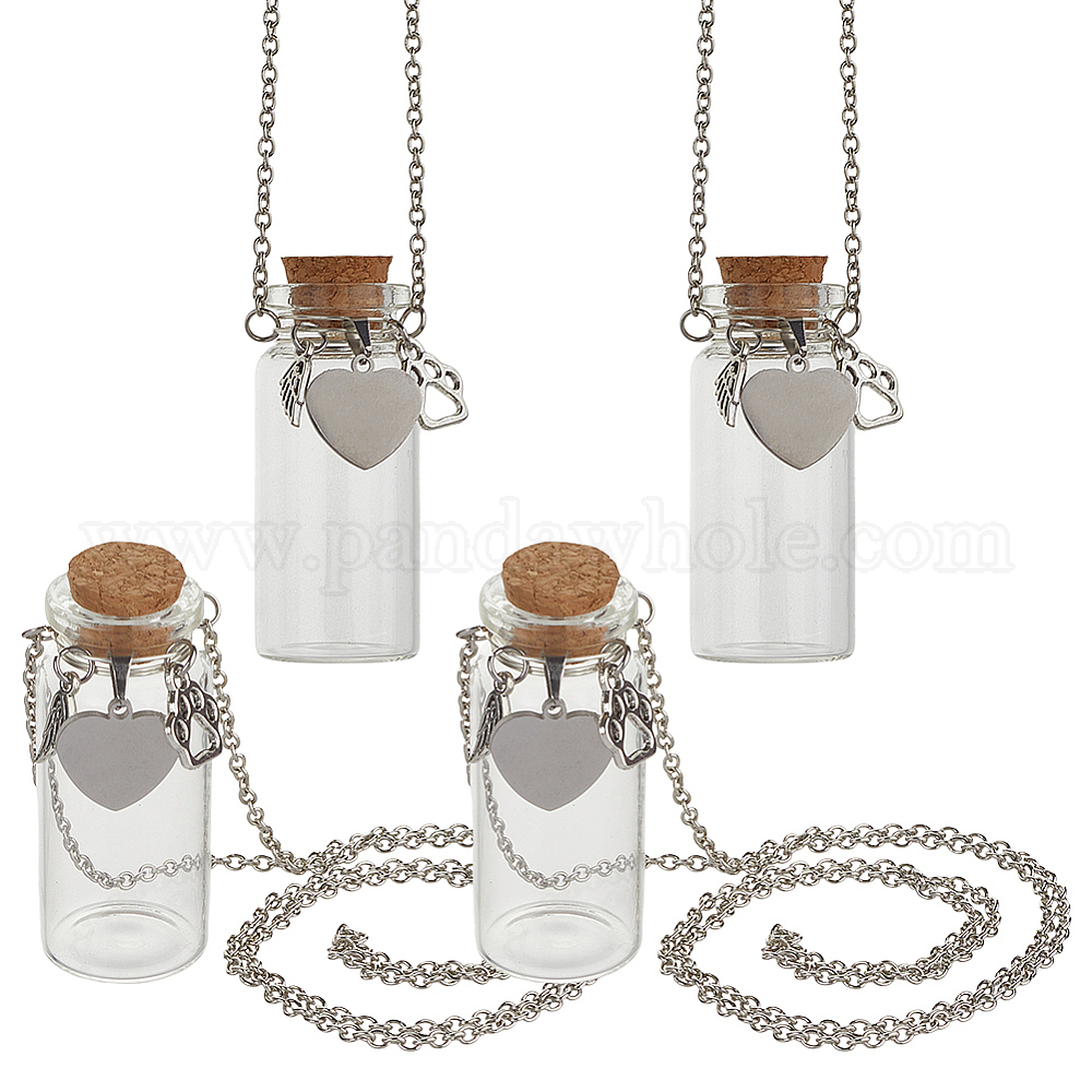 4шт. стеклянные пробковые бутылки желаний с подвеской в виде сердца из сплава и железной цепью, старинное серебро и платина