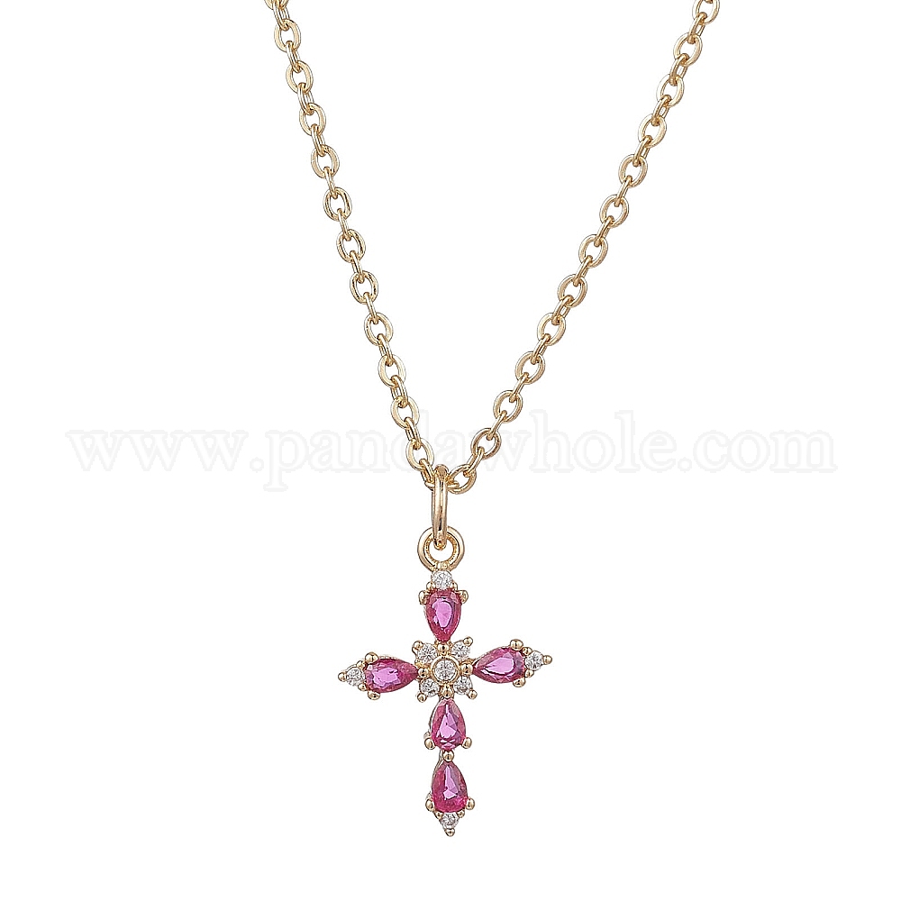 Латунный стеклянный крестик 304 ожерелья из нержавеющей стали с цепочкой для женщин, ярко-розовый
