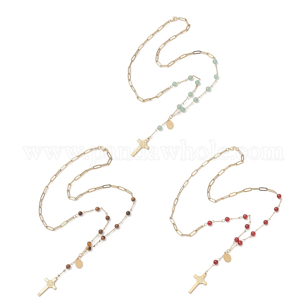 3 шт. 3 стили ожерелья с круглыми бусинами-четками из натурального сердолика, зеленого авантюрина и тигрового глаза, 304 Женские ожерелья с подвеской в виде креста из нержавеющей стали, золотые