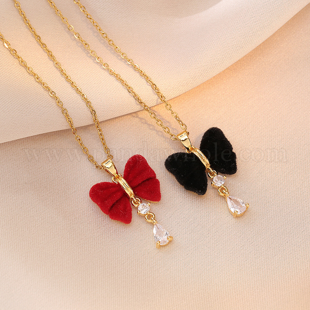 Рождество 304 Женские ожерелья с подвесками в виде банта из нержавеющей стали, стразами и флокированной тканью, золотые