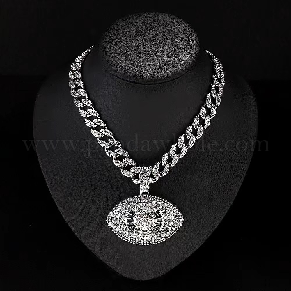 • Платина Мужские кубинские звенья цепи из цинкового сплава, полностью украшенные кристаллами и стразами, с черной эмалью и кулоном от сглаза, платина, 17.72 дюйм (45 см)